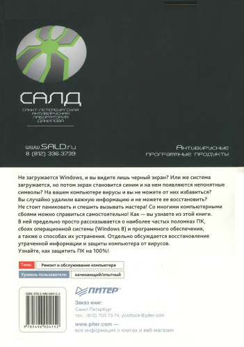 ИЗ ИЗДАНИЯ: Не загружается Windows, и вы видите лишь черный экран? Или же система загружается, но потом экран становится синим и на нем появляются непонятные символы? На вашем компьютере вирусы и вы не можете от них избавиться? Вы случайно удалили важную информацию и не можете ее восстановить? Не стоит паниковать и спешить вызывать мастера! Со многими компьютерными сбоями можно справиться самостоятельно! Как - вы узнаете из этой книги. В ней предельно просто рассказывается о наиболее частых поломках ПК, сбоях операционной системы (Windows 8) и программного обеспечения, а также о способах их устранения. Отдельно обсуждается восстановление утраченной информации и защиты компьютера от вирусов. Узнайте, как защитить ПК на 100%! |