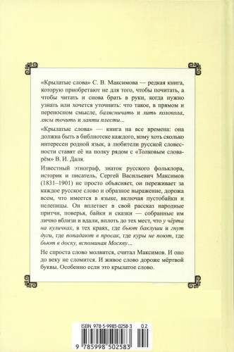 ИЗ ИЗДАНИЯ: «Крылатые слова» С.В. Максимова - редкая книга, которую берут в руки не на время, которая должна быть в библиотеке каждого, кому хоть сколько интересен родной язык, а любители русской словесности ставят ее на полку рядом с «Толковым словарем» В.И. Даля. Известный этнограф, знаток русского фольклора, историк и писатель, Максимов (1831-1901) не просто объясняет, он переживает за каждое русское слово и образное выражение, считая нужным все, что есть в языке, включая пустобайки и нелепицы. Он вплетает в свой рассказ народные притчи, поверья, байки и сказки - собранные им лично вблизи и вдали, вплоть до тех мест, что у черта на куличках, в тех краях, где бьют баклуши и гнут дуги, где попадают в просак, где куры не поют, где бьют в доску, вспоминая Москву... Книга выходит в популярной серии «Русская словесность» и рассчитана на массового читателя. |